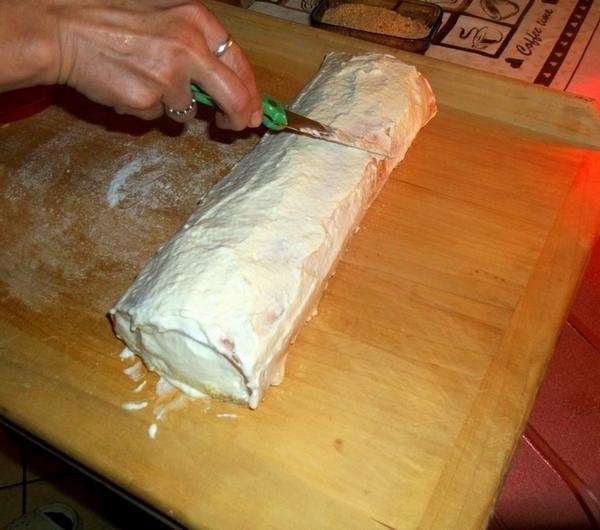 żelatynę śmietana zacznie się szybko ścinać.Musimy zdążyć napełnić roladę, zwinąć i posmarować po wierzchu.