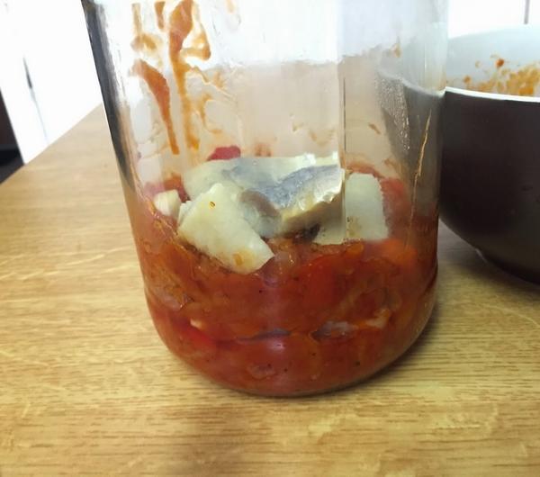 Między czasie można posolić i popieprzyć. W kubku 3 łyżki przecieru rozrabiamy z odrobią