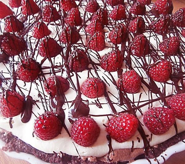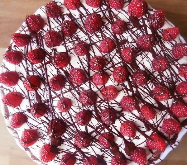Składniki:Kruche ciasto:2 żółtka220 gram maki tortowej pszennej100 gram cukru pudru2 łyżki gorzkiego kakao100 gram masłałyżka oliwy3 łyżki lodowatej wodyWykonanie: Wszystkie składniki zagnieść na jednolite i gładkie ciasto, wyłożyć na formę do tarty (oblepiając dno i boki formy) ponakłuwać widelcem i schłodzić w lodówce przez około godzinę. Następnie wyciągnąć ciasto i piec w temperaturze 180 stopni przez 25 minut. Formę z ciastem wkładamy do jeszcze nie nagrzanego piekarnika.Frużelina:200 gram malinpól szklanki cukru1 łyżeczka maki ziemniaczanej rozpuszczona w 1,5 lyżki zimnej wodyWykonanie: Maliny wymieszać z cukrem i podgrzewać na małej mocy palnika do rozpuszczenia się cukru. Po tym czasie dodać do owoców mąkę ziemniaczaną i całość zagotować, delikatnie przestudzić.Mus z gorzkiej czekolady:150 gram gorzkiej czekolady250 ml śmietany kremówki 36 % dobrze schłodzonej2 łyżki cukru pudru3 łyżki likieru tiramisu*Wykonanie: Kremówkę ubić na sztywno, pod koniec dodać cukier puder. Czekoladę połamać na kawałki i rozpuścić wraz z likierem w kąpieli wodnej, lekko przestudzić. Gotową czekoladę dodać do kremówki i delikatnie zmiksować do połączenia się składników.Mus z białej czekolady:150 gram białej czekolady dobrej jakości250 ml śmietany kremówki3 łyżki likieru tiramisu*Wykonanie: Czekoladę połamać na kawałki i wraz z likierem rozpuścić w kąpieli wodnej. Kremówkę ubić na sztywno i powoli dodawać przestudzoną czekoladę, wymieszać do połączenia się składników.Do przybrania:300 gram malin50 gram czekolady gorzkiej (czekoladę rozpuścić w kąpieli wodnej)Wykonanie tarty: Delikatnie przestudzony spód smarujemy przygotowaną jeszcze ciepła frużeliną, wyrównujemy, wkładamy do lodówki na 30 minut do schłodzenia. Po tym czasie tartę wyciągamy i nakładamy najpierw ciemny a później jasny mus. Całość przybieramy malinami i polewamy czekoladą, wstawiamy do lodówki do schłodzenia.* w wersji dla dzieci pomijamy likier