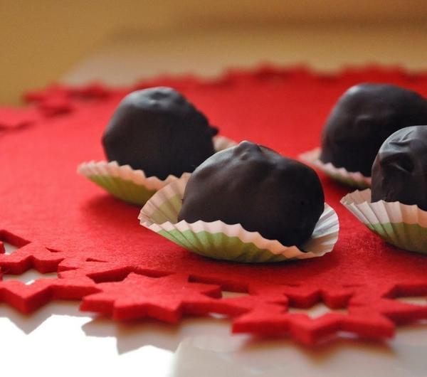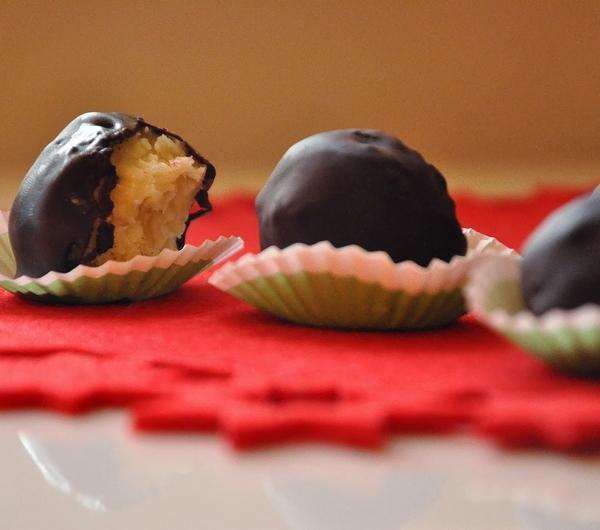 /około 25 pralinek/70 g wiórków kokosowych150 g płatków migdałów100 ml śmietanki 30 %80g masła3 czubate łyżki cukru pudru100g gorzkiej czekolady, min. 70%Płatki migdałów lekko rozdrobnić. Wymieszać je z cukrem pudrem oraz wiórkami. Odstawić. W rondelku rozpuścić masło razem ze śmietanką. Przygotowanym płynem zalać odstawione składniki. Wymieszać i ostudzić. Włożyć na noc do lodówki.Czekoladę rozpuścić w kąpieli wodnej. Z masy uformować kulki i oblać je czekoladą. Położyć na talerzu z papierem do pieczenia, wtedy będzie je łatwiej odkleić. Wstawić na 30 minut do lodówki (do zastygnięcia).Smacznego!