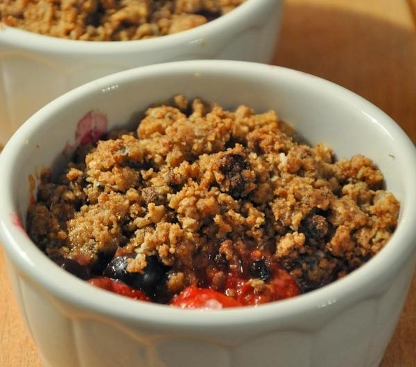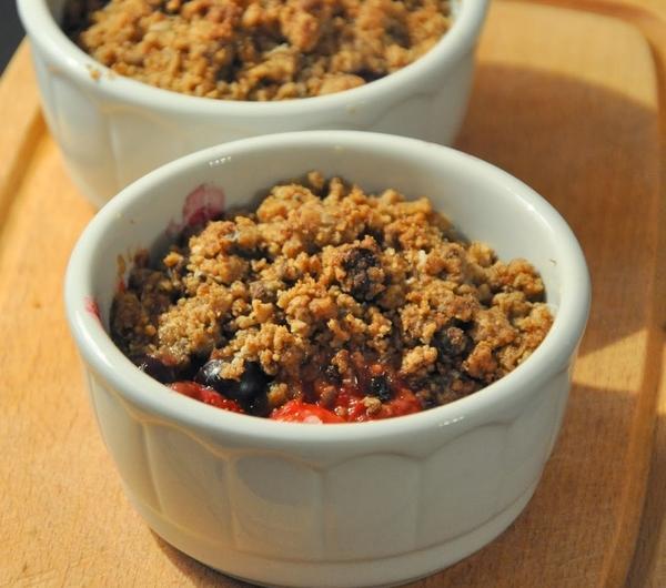 /4 kokilki/2/3 szklanki mąki pszennej1/3 szklanki cukru muscovado2 łyżki otrębów pszennych100g masła4 łyżki płatków migdałów2 szklanki truskawek1 szklanka borówki amerykańskiejDo miski wsypać mąkę, otręby oraz cukier. Dodać pokrojone na kawałeczki masło. Zrobić kruszonkę rozcierając składniki na niewielkie grudki. Wstawić na 30 minut do lodówki.Do kokilek włożyć owoce (kilka truskawek plus borówki), Położyć płatki migdałów. Posypać kruszonką.Piec w piekarniku nagrzanym do 200 stopni przez około 20 minut.Najlepsze jest prosto z piekarnika :)Smacznego!