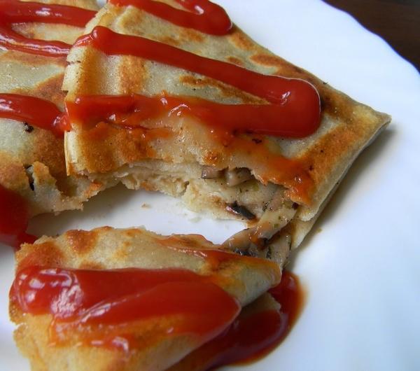 6. Następnie od strony tej smażonej nakładamy farsz: trochę sera, trochę kukurydzy, trochę pieczarek i jeszcze sypiemy oregano.