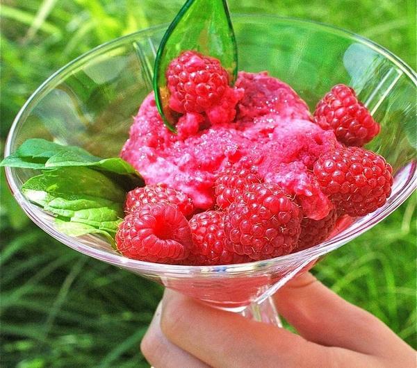 Taki malinowy sorbet jest niezwykle pyszny i bardzo orzeźwiający.Ma niesamowicie intensywny kolor i aromat świeżych malin.Serwuję go ze świeżymi malinami i listkami mięty.Koniecznie w upalne letnie popołudnie...:)