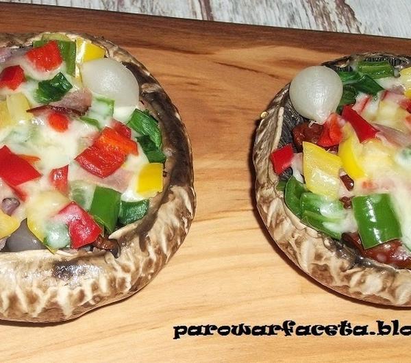 Składniki :2 pieczarki Portobello3 papryczki chili ( zielona, czerwona i żółta)2 plastry szynki szwarcwaldzkiej8 cebulek perłowych4 suszone pomidoryszczypiorek1 łyżka startej mozzarelli
