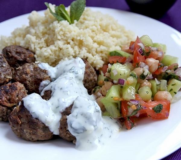 Przygotowanie:MięsaW misce wymieszać mięso, cebulę, cynamon, pieprz i sól. Zwilżyć dłonie wodą i formować nieduże pulpeciki. Na patelni rozgrzać tłuszcz i usmażyć kotleciki. Przełożyć na talerz wyłożony papierowymi ręcznikami, aby odsączyć je z nadmiaru tłuszczu.Sosu jogurtowo - miętowegoW miseczce wymieszać jogurt z czosnkiem i miętą, doparwić do smaku solą i pieprzem oraz odrobiną cukru.Pulpeciki podawać z kuskusem i sałatką pomidorowo - ogórkową z ciecierzycą .