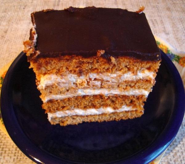 Składniki:Ciasto: jaja 2cukier ½ szklankimąka pszenna 0,5 kgsoda oczyszczona 1,5 łyżeczkimiód 2 łyżkimasło roślinne 5 dagaromat waniliowyKrem: mleko 0,5 lkasza manna 3 czubate łyżkicukier puder 1 szklankamasło roślinne ¾ kostkiaromat waniliowy lub śmietankowyPolewa: czekolada gorzka 150 gmasło 2 łyżkimleko 10 łyżekWykonanie:Przygotowanie ciasta: Jaja utrzeć z cukrem. Masło rozpuścić razem z miodem, przestudzić dodać do jajek. Następnie połączyć z mąką i sodą. Wyrobić gładkie ciasto. Podzielić na 4 równe części (do blaszki o wymiarach 21x25 cm). Porcję ciasta równo rozłożyć w blaszce, wyłożonej papierem do pieczenia, na grubość 2 mm. Piec w piekarniku nagrzanym do 180 stopni przez 10 minut.Przygotowanie kremu: Na gotujące się mleko wsypywać kaszę. Zagotować, ciągle mieszając. Ostudzić. Masa musi być bardzo gęsta. Masło utrzeć z cukrem do białości, dodawać po łyżce kaszy, wciąż ucierając. Na końcu dodać aromat.Przygotowanie polewy: kostki czekolady rozpuścić w wodnej kąpieli, dodać masło i śmietankę, dokładnie wymieszać.Placek miodowy ułożyć na tacy. Rozsmarować na nim 1/3 kremu, przykryć kolejnym plackiem itd. Ostatni placek polać czekoladą i można udekorować.