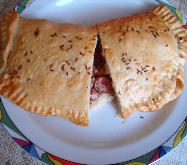 Złożyć placki na pół, brzegi dobrze docisnąć (np. widelcem - będzie ozdobny wzór). Posmarować rozmąconym białkiem. (Można posypać kminkiem.)