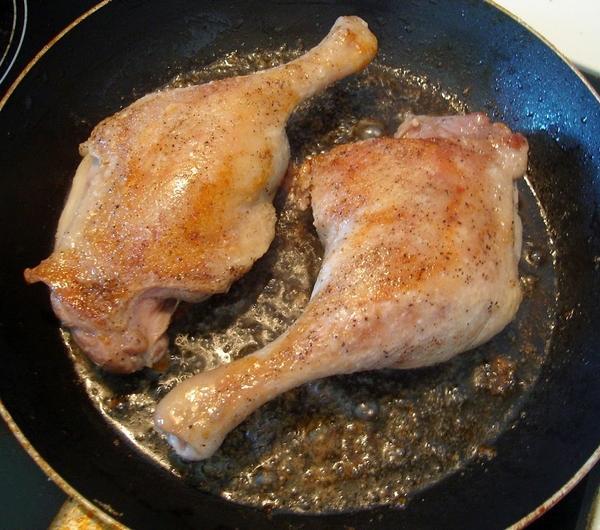 Nogi kaczki umyć, osuszyć, Obsypać solą i pieprzem. Rozgrzać olej na patelni, smażyć nóżki z każdej strony na złoto.