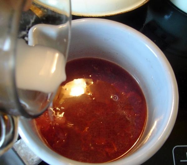 W rondelku podgrzać dżem do roztopienia, powoli dolewać sok z cytryny i pomarańczowy, dodać przyprawy, rozmieszać. Mąkę ziemniaczaną rozprowadzić w wodzie, dodać do sosu, zagotować.