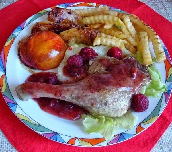 Składniki:nogi kaczki 2sól, pieprzolej do smażenialiść laurowy 1kostka rosołowa 1woda 400 mlSos:dżem z czerwonych owoców ½ szklankisok pomarańczowy ½ szklankisok z cytryny 1/7 szklankiimbir mielony 1 szczyptapieprz Cayenne 1 szczyptamąka ziemniaczana 1 łyżeczkawoda 1 łyżkaWykonanie: