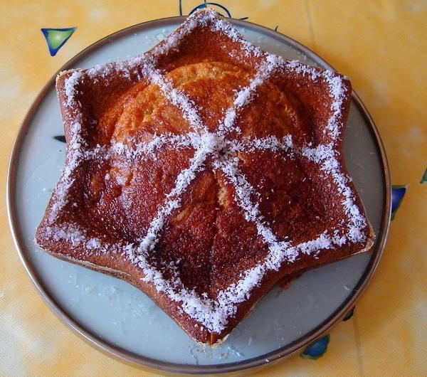Składniki:Ciasto: jaja 3cukier 1 szklankajogurt naturalny 1 szklankaolej 1 szklankakasza manna 1 szklankamąka 1 szklankawanilia 1 łyżeczkaproszek do pieczenia 3 łyżeczkiwiórki kokosowe do dekoracjiSos: cukier 1 szklankawoda 1 szklankasok z cytryny 1-2 łyżkiWykonanie: