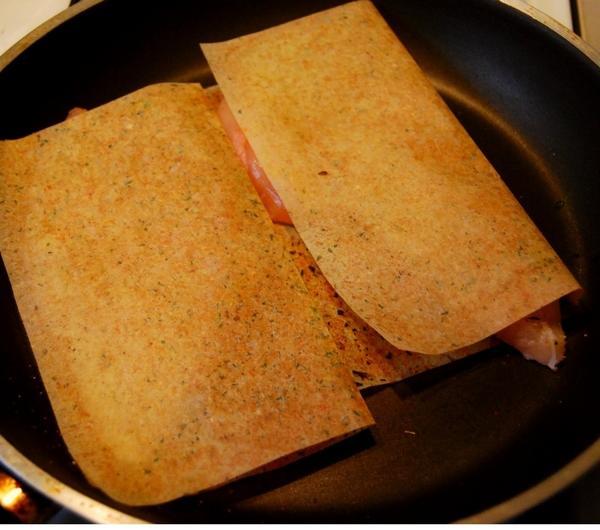 Pierś z kurczaka dokładnie oczyszczamy. Lekko rozbijamy, owijamy w papirus i smażymy pięć minut z każdej strony. Usmażonego