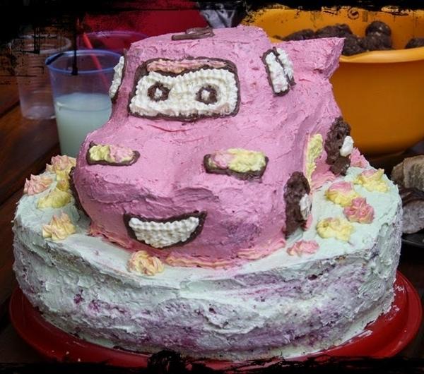 Na drugie urodziny synka postanowiłam upiec tort w kształcie samochodu.Ponieważ wydawało mi się,że będzie za mały na przewidywaną liczbę osób, postanowiłam postawić go na okrągłym torcie. Ponieważ nie miałam odpowiednio dużej okrągłej formy na podstawę, piekłam prostokątne