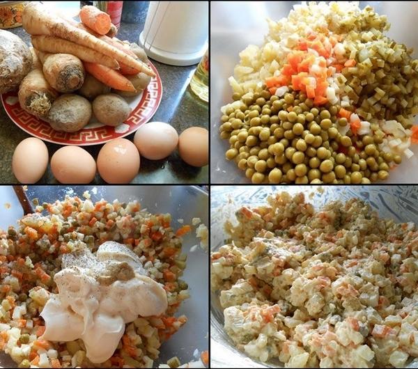 przepisów na sałatkę warzywną jest mnóstwo. Ja podaje przepis na wersje podstawową, moją ulubioną. Ważną sprawą jest żeby wszystkie warzywa gotować razem i wyjmować poszczególne warzywa po kolei jak już są miękkie,ale nie rozgotowane - najpierw ziemniaki a następnie marchew, pietruszkę i seler.Składniki:3 pietruszki4 marchewki1 seler4 ziemniaki3 - 4 jajkaogórki kiszone (według uznania u mnie ok. 350-400 g)1 puszka groszkumajonezmusztardasólpieprzWykonanie:Warzywa ugotować w mundurkach w osolonej wodzie, odcedzić i ostudzić. Jajka ugotować na twardo, groszek odcedzić od wody.Warzywa, jajka i ogórki pokroić w drobną kostkę. Do warzyw dodać groszek i wszystko wymieszać.Do warzyw dodać majonez, 2 - 3 łyżeczki musztardy, sól i pieprz a następnie wszystko dokładnie wymieszać.W razie potrzeby doprawić solą i pieprzem.
