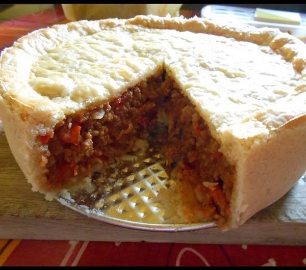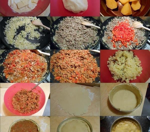 Tort mięsny w moim wykonaniu to kruche ciasto faszerowane mięsnym farszem. Danie to jest idealne na obiad zwłaszcza, że można je przygotować dzień wcześniej a upiec w momencie, który najbardziej nam odpowiada. Tort ten jest nie tylko pyszny ale i bardzo sycący. Tort ten piekłam w tortownicy o średnicy 22 cm.Składniki:Ciasto:300g mąki90g smalcu90g masła1 czubata łyżeczka proszku do pieczenia4 łyżki zimnej wodyszczypta soli1 jajko do posmarowania ciastaFarsz :2- 3 średnie ziemniaki500g mielonego mięsa wołowego2 cebule1 papryka1 puszka pomidorów2 ząbki czosnku4 łyżki sosu Worcester2 łyżka sosu sojowegoostra i słodka paprykasólpieprzWykonanie:Mąkę przesiać przez sito, dodać smalec, masło, sól oraz wodę i zagnieść ciasto. Ciasto owinąć folią spożywczą i włożyć do lodówki na min. 30 minut.Ziemniaki obrać, umyć i ugotować w osolonej wodzie. Aby ziemniaki się szybciej ugotowały można pokroić je w mniejsze kawałki.Cebulę pokroić w kostkę, paprykę umyć, obrać i również pokroić w drobną kostkę.Cebulę zeszklić na oleju, następnie dodać przeciśnięty przez praskę lub drobno posiekany czosnek i mięso mielone. Smażyć na średnim ogniu, aż mięso zmieni kolor. Dodać paprykę, pokrojone pomidory i przyprawy. Smażyć aż papryka będzie miękka a nadmiar płynu odparuje.Gotowe mięso przełożyć do miski i dodać ziemniaki przeciśnięte przez praskę. Całość dokładnie wymieszać. Po dodaniu ziemniaków warto spróbować farsz i ewentualnie doprawić go jeszcze solą i pieprzem.Piekarnik rozgrzać do temperatury190°C. 2/3 ciasta rozwałkować w kształt koła i wyłożyć nim natłuszczoną tortownicę (spód i brzegi). Formę wypełnić mięsnym farszem a następnie przykryć go pozostałym ciastem rozwałkowanym w kształt koła. Brzegi ciasta docisnąć pomagając sobie nożem lub widelcem. Nadmiar ciasta można odciąć i wykorzystać go do dekoracji ciasta, ja jednak zostawiłam go wokół brzegów ciasta.Ciasto posmarować roztrzepanym jajkiem i piec go w temperaturze 190°C przez 15 minut a następnie zmniejszyć temperaturę do 180° i piec jeszcze przez 30 – 40 minut, do momentu aż ciasto się zarumieni.