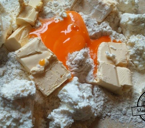 daję do lodówki na 3h (moje było 4h). Po wyciągnięciu wałkuję go na grubość ok 2mm, kółkiem do pizzy wycinam kwadraty ok 4x4 cm, nakładam