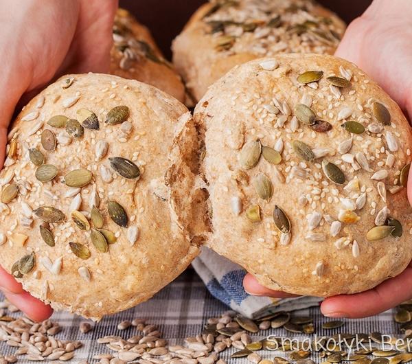 Składniki:400g mąki pszennej typ 650300g mąki pełnoziarnistej300ml letniej wody200ml mleka120g ziaren (u mnie sezam, pestki dyni i słonecznika)25g drożdży świeżych2 łyżki roztopionego masła2 płaskie łyżeczki soli1 łyżeczka cukru1 białko i 1 łyżka mleka do posmarowania bułekziarna do posypania