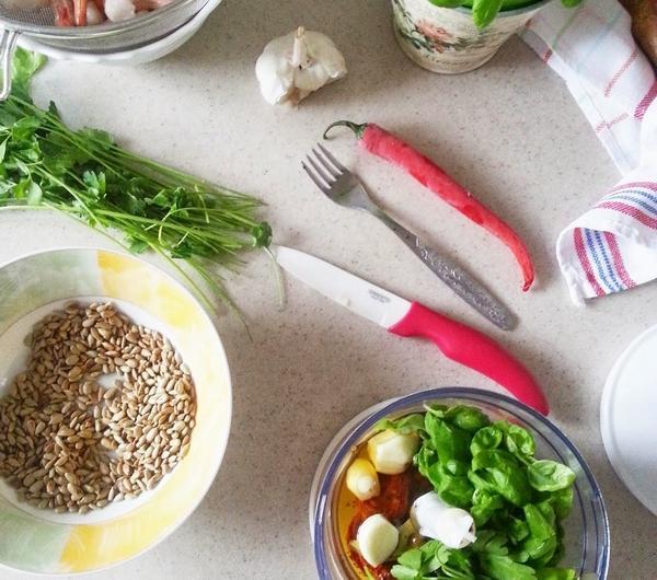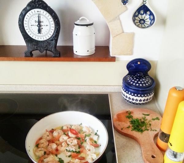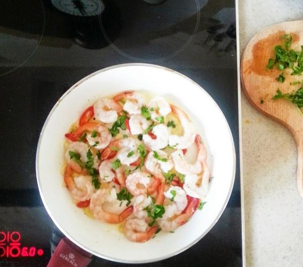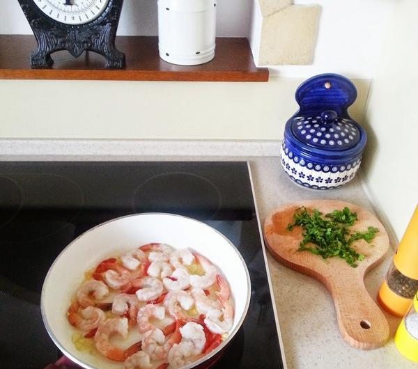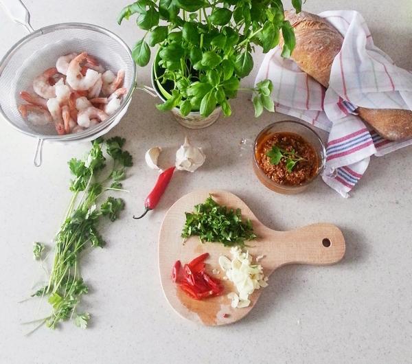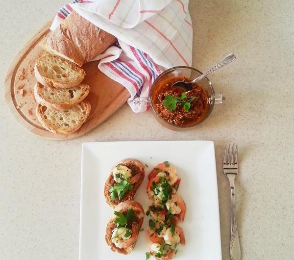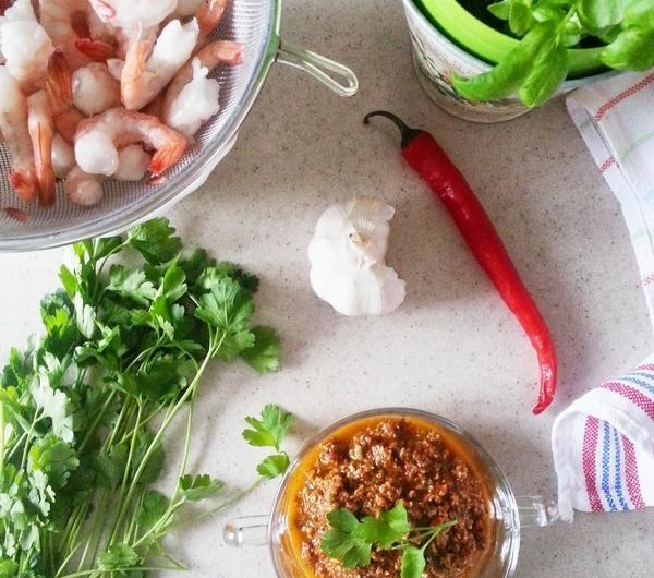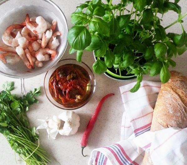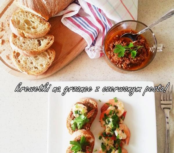 składniki:opakowanie krewetekpół papryczki chilli2-3 ząbki czosnkugarść świeżej pietruszkimasłobagietka (np. classico z Lidla)Czerwone pesto:słoiczek suszonych pomidorów z kaparami w oliwiegarść bazyliigarść natki pietruszki2-3 ząbki czosnku2 garści uprażonego słonecznikaPesto: Wszystkie składniki wrzucamy do malaksera i miksujemy i przekładamy do miseczki. (Suszone pomidory miksujemy razem z oliwą).Krewetki rozmrażamy, myjemy i wycieramy, pozbywając się nadmiaru wody. Czosnek i papryczki chilli kroimy w plasterki. Siekamy pietruszkę. Masło rozpuszczamy na patelni. Dorzucamy czosnek i paprykę i smażymy do zrumienienia. Następnie układamy krewetki na patelni i smażymy po 2 minuty z każdej strony. Posypujemy dokładnie natką pietruszki. Kromki bagietki smarujemy pesto, nakładamy na nie krewetki i natkę pietruszki i zajadamy. Idealny posiłek!
