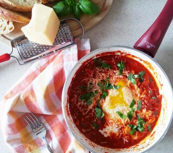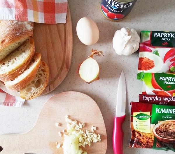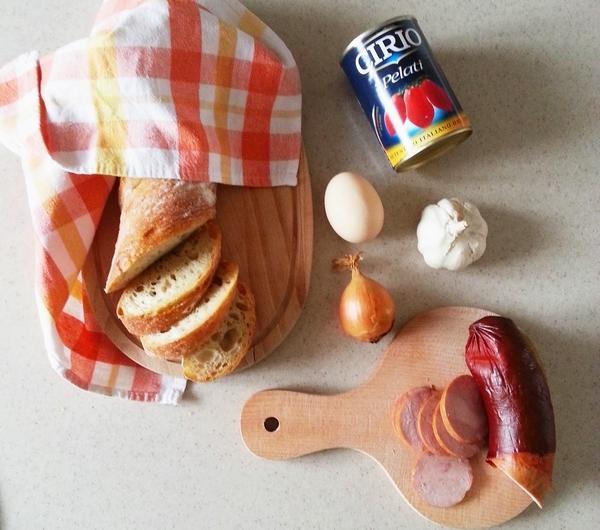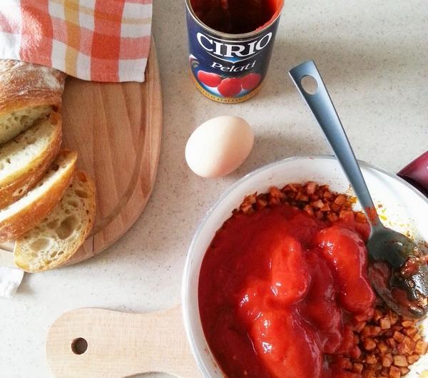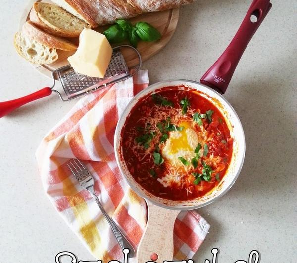 składniki:puszka pomidorów pelatikawałek ulubionej kiełbasy (użyłam lisieckiej)1-2 jajka (w zależności od wielkości i jak bardzo głodni jesteśmy)łyżka słodkiej paprykiłyżeczka ostrej paprykipół łyżeczki papryki wędzonej (opcjonalnie)duża szczypta kminku mielonegopół małej cebuliząbek czosnkuolej rzepakowysól, pieprzodrobina cukru (jeśli danie jest zbyt kwaśne-zależy od pomidorów)bagietkastarty ser żółtybazyliaCzosnek i cebulę kroimy w kostkę i przysmażamy na oleju. Dodajemy pokrojoną w kostkę kiełbasę i czekamy, aż się przyrumieni. Następnie dodajemy wszystkie przyprawy i chwilę podsmażamy. Na patelnię wrzucamy pomidory i dusimy około 10 minut. Gdy masa zgęstnieje na środku robimy małe zagłębienie i wbijamy tam jajko (lub 2 obok siebie). Przykrywamy pokrywką i dusimy do momentu jak białko się zetnie, ale żółtko nadal będzie płynne. Posypujemy startym żółtym serem i posiekaną bazylią. Świetnie smakuje, że świeża bagietką.