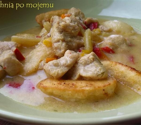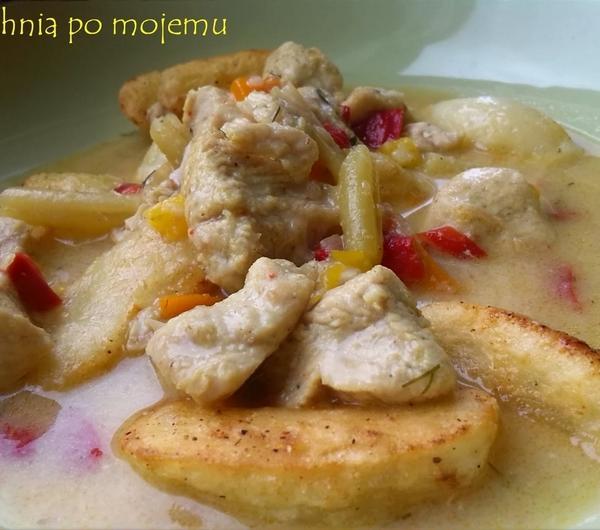 Pieprzu białego nie należy oszczędzać. Odstawiamy mięso na 2-3 godzinki w chłodne miejsce. Następnie obtaczamy w mące. Podsmażamy na mocno rozgrzanym tłuszczu. Wrzucamy na gotującą wodę. Na tym samym tłuszczu szklimy cebulę z dodatkiem vegety. Wrzucamy do mięsa. Dusimy ok 30 minut pod przykryciem. W tym czasie kroimy paprykę w kostkę a marchew w słupki. Najpierw dorzucamy marchew i fasolkę bo się dłużej gotują. Na ostatnie kilka minut wrzucamy paprykę. Kiedy zmięknie zagęszczamy sos odrobiną maki i łyżką śmietany. Gotowe. Dla koloru wrzucamy odrobinę kopru.U nas z uwielbianymi kluskami śląskimi, które wczoraj lepiłam w ramach weekendowej rozrywki ;) Kluseczki z ziemniaków gotowanych na parze, więc samo zdrowie - no może gdyby nie to, że Mąż postanowił je pysznie odsmażyć, a nie odgotować ;).