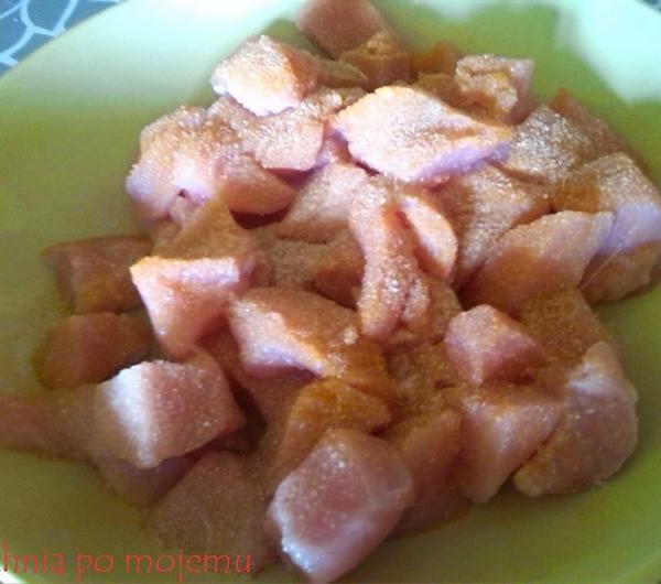 60 - 70 dag piersi z indyka1/2 cebuli1/2 malej papryki czerwonej1/2 malej papryki żółtej1 mała marchewkilka strąków fasoli szparagowej (najlepiej zielonej)ok 1 litra wrzątkusólpieprz białyczosnek suszonykurkumaszczypta gałki muszkatołowejkilka płatków chilimaka do obtoczenia mięsa (żytnia z pszenną)olej do przysmażeniaPrzygotowanie:Mięso kroimy w dość grubą kostkę. Przyprawiamy białymi przyprawami i kurkumą.