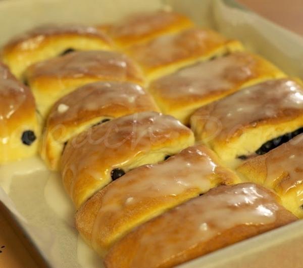Sposób przygotowania:Do letniego mleka dodaj 60 g masła, cukier i roztrzepane jajka. Wymieszaj.Z drożdży przygotuj rozczyn - drożdże utrzyj z łyżką cukru i kilkoma łyżkami ciepłego mleka.Mąkę pszenną wymieszaj z solą. Następnie dodaj mleko i drożdże. Wyrób ciasto, by było miękkie i elastyczne. Uformuj kulę, włóż do oprószonej mąką miski i odstaw na 1,5 godziny w ciepłe miejsce. Powinno podwoić objętość.Po tym czasie wyjmij ciasto z miski, krótko wyrób i rozwałkuj na duży kwadrat.Blachę o wymiarach 25 x 36 cm wysmaruj masłem i wyłóż papierem do pieczenia.Rozwałkowane ciasto przekrój na pół w celu otrzymania dwóch prostokątów. Obie części posmaruj masą z białego sera: ser + 2 łyżki masła + 2 żółtka + mąka ziemniaczana + cukier z wanilią rozgnieć widelcem.Masę z białego sera posyp jagodami. Każdy z prostokątów złóż na pół wzdłuż dłuższego boku, następnie pokrój nożem na 8-10 częsci.Bułeczki układaj na blaszce bardzo blisko siebie. przykryj ściereczką i pozostaw do ponownego wyrośnięcia na 30-45 minut.Piecz w 200 st. przez 25-30 minut. Jeszcze ciepłe polukruj.