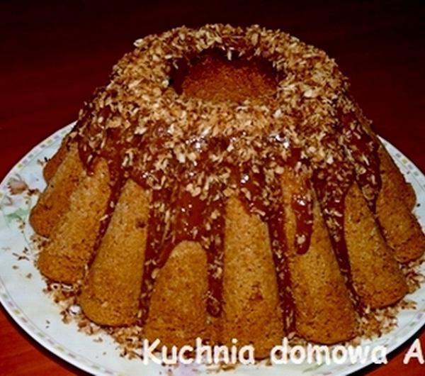 Składniki:Ciasto:180 g mąki pszennej100 g mąki ziemniaczanej5 jajek100 g masła300 g masy krówkowej w puszcesok z 1 cytryny3 łyżki cukru2 łyżeczki proszku do pieczeniaolejek waniliowyPolewa kajmakowa:1 00 g masy krówkowej4 łyżki mlekaolejek waniliowyDodatkowo do posypania:30 g uprażonego kokosu lub 30 g uprażonych migdałówSposób przygotowania:1. Masło i masę krówkową połączyć, delik atnie podgrzać na gazie.2. Białka ubić na sztywno, następnie stopniowo dodawać cukier, po jednym żółtku, dodać sok z cytryny. Do ubitej masy jajecznej dodać masę kajmakową z masłem i obydwie mąki przesiane z proszkiem do pieczenia, wymieszać za pomocą drewnianej łopa t ki .3. Blaszkę wysmarowaną tłuszczem i obsypaną bułką tartą wykładamy ciastem, piec 45-50 minut w 180 st. C.4. Zrobić sos: wszystkie składniki podgrzać na małym ogniu, jeszcze ciepłą babkę polać ciepłym sosem i posypać prażonym na suchej patel ni kokosem lub migdałam i.Smacznego!!!