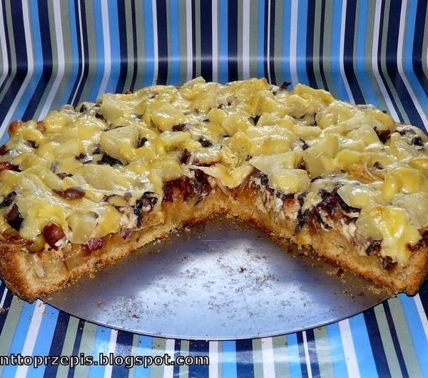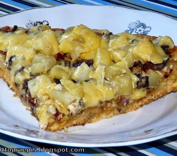 A wszystko zaczęło się od idealnego ciasta na tartę ...Gdy łapie mnie stosowny nastrój i potrzebuję pozbyć się nadmiaru energii, zagniatam kilka porcji takiego ciasta na zapas, przechowując je następnie w zamrażalniku (przepis własny TU). Wtedy wykonanie szybkiego obiadu jest banalnie proste i bezproblemowe (inna wariacja w temacie tarty TU).Często stosuję zasadę pod tytułem: tarta na winie - czyli co się nawinie to do tarty! Idealny sposób na wyczyszczenie lodówki z niepierwszej świeżości składników. Tym razem mój wybór padł na zestaw:obrastająca szczypiorem cebulaboczek z kończącym się terminem przydatności do spożyciazwiędłe pieczarkizeschnięty ser żółtyDo tego sięgnęłam do spiżarni po puszkę ananasów oraz ulubione przyprawy - w efekcie wyszła sycąca i smaczna propozycja obiadowa.