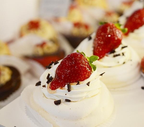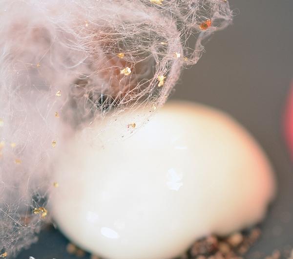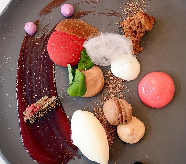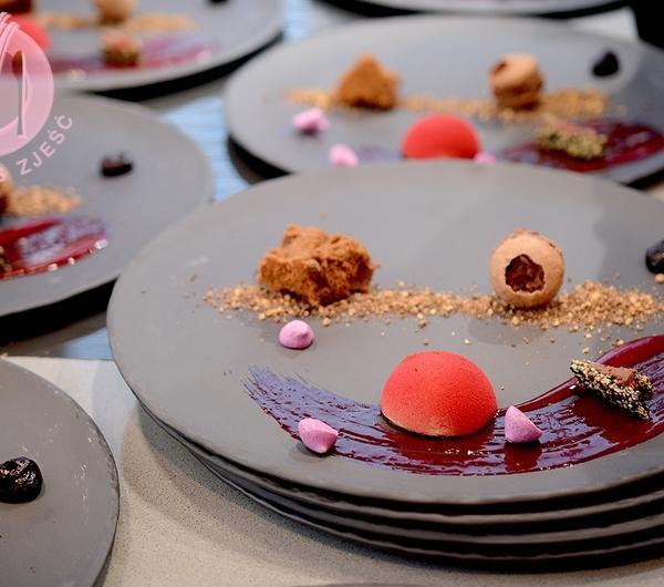 Chałwa w zamszu malinowym, wata cukrowa z cukru fiołkowego, lody waniliowe z tonką, mus czekoladowy, mus z hibiskusa, makaronik, brownie, jadalne złoto, sezamki. Poezja!