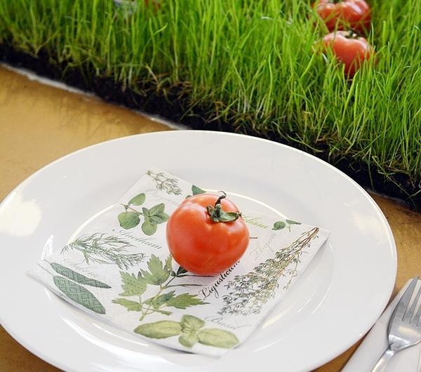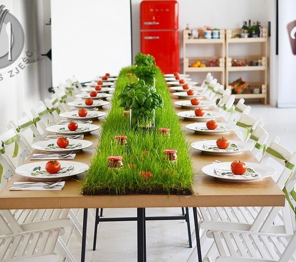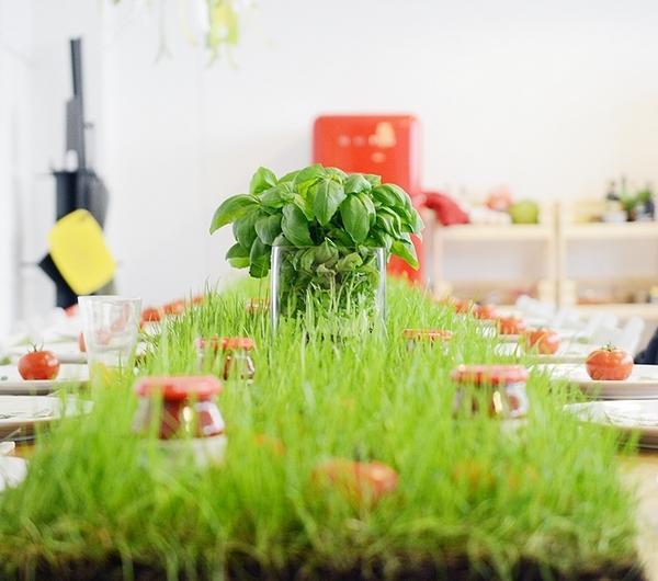 Do studia Cook Up przybyłyśmy razem z Magdą nieco przed czasem i przed naszymi oczami ukazała się piękna dekoracja stołu. Było zielono - na stole był rozwinięty dywanik z prawdziwej trawy, na nim pomidory i bohater warsztatów czyli koncentrat Pudliszki. W wazonach wyjątkowo prezentowały się zioła.