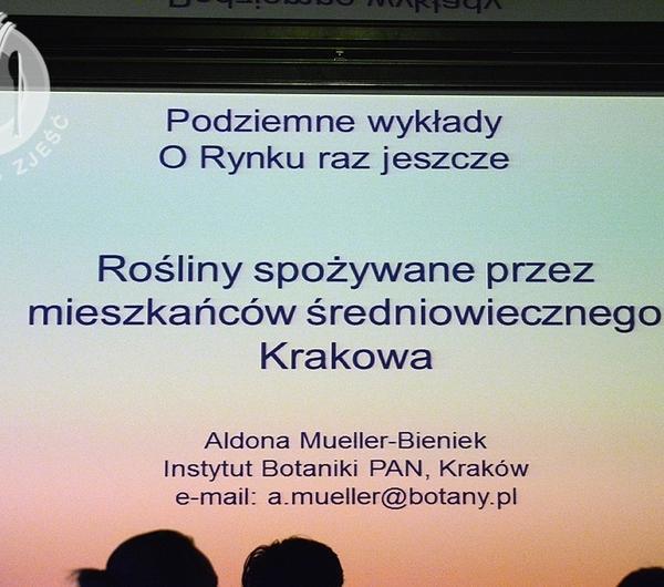 Wykład "Rośliny spożywane przez mieszkańców średniowiecznego Krakowa"25 . 03.2014Blogerzy nie tylko gotują, robią zdjęcia, chodzą na warsztaty. Blogerzy też się dokształcają i pojawiają na wykładach. Razem ze sporym gronem blogerek i blogerów wybraliśmy się do Podziemi Rynku aby posłuchać co było jedzone w średniowiecznym Krakowie. Okazuje się, że były to kiszonki, rośliny kapustne, groch, zboża, śliwki, wiśnie, jabłka, soczewica, bób, figi (raczej importowane), rzepak. Ze zbóż najpopularniejsze było proso, kolejno żyto, jęczmień, amarantus. Ciekawe prawda? Wykład był dość krótki, liczyłam na dużo więcej, bo temat jest bardzo ciekawy.