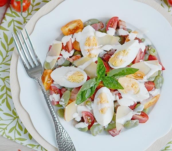 Bób, jeszcze lekko chrupiący, podpieczony boczek, jajka, odrobina sera i pomidorów. Bardzo smaczne i pasujące do siebie połączenia smaków. Polecam, póki bób jest na straganach, cieszmy się jego smakiem! :-)Składniki:1 kg bobu6 jajekok. 200 g boczkukilka pomidorów koktajlowychser (np. Bursztyn)sól, pieprz4 łyżki majonezusok z 1/2 cytrynyWykonanie:Bób gotujemy w osolonej wodzie, tak aby był al dente. Studzimy i łuskamy. Jajka gotujemy na twardo i studzimy. Następnie kroimy w ćwiartki.Boczek kroimy w słupki i podsmażamy na rumiano na patelni, również studzimy. Pomidorki myjemy i kroimy w ćwiartki.Na talerzu układamy 1/4 bobu, jajek, boczku i pomidorków, posypujemy płatkami sera i polewamy sosem z majonezu, soku z cytryny i przypraw. Składniki wystarczą na ok. 4 porcje sałatki.