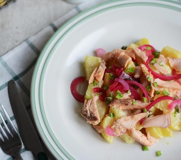 W ostatnich dniach chodziła za mną taka sałatka, więc kiedy tylko zobaczyłam stoisko Pstrąga Ojcowskiego na Najedzeni Fest, od razu go kupiłam z myślą właśnie o takiej sałatce. Z pomocą też przyszła Edyta, która dzień później opublikowała na swoim blogu sałatkę ziemniaczaną, również autorstwa Grzegorza, która jak pewnie zauważycie, jest modyfikacją sałatki Najsztuba.Sałatka jest bardzo smaczna, sprawdzi się zarówno jako danie obiadowe czy propozycja na śniadanie lub kolację.Składniki:700 g ziemniaków1 żółtko150 ml oleju rzepakowego1 łyżeczka musztardy miodowejsok z cytryny5 łyżek kaparów250 g wędzonego pstrąga2 czerwone cebule100 ml białego octu winnego100 ml wody2 łyżki cukrusól, pieprzpęczek szczypiorkuWykonanie:Ziemniaki gotujemy w mundurkach w lekko osolonej wodzie, aż będą miękkie. Odcedzamy i studzimy (można zalać je zimną wodą, aby zapobiec dalszemu "gotowaniu się" w czasie stygnięcia). Następnie obieramy je i kroimy w kostkę lub plastry.Żółtko mieszamy delikatnie z musztardą, a następnie dodajemy olej rzepakowy, po kropelce, ciągle mieszając trzepaczką, aż wykorzystamy cały olej i powstanie nam majonez. Doprawiamy solą, pieprzem oraz kilkoma kroplami soku z cytryny.Kapary przelewamy wrzątkiem i odstawiamy na bok (mają wtedy lepszy smak).Cebulę kroimy w piórka, następnie zanurzamy na 30 sekund we wrzątku, po czym wkładamy do miski z zimną wodą (może być z lodem) i studzimy. Z octu, wody i cukru gotujemy zalewę, po zagotowaniu się wyłączamy, dodajemy odsączoną cebulę i marynujemy ją około 15 minut. Odcedzamy. Dzięki octowej zalewie cebula ma taki ładny różowy kolor.
