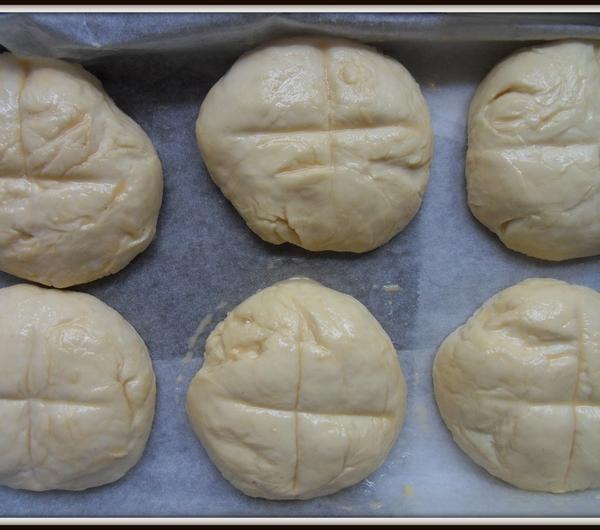 Kiedy ciasto podwoi objętość,wyjąć je, wyrobić, podzielić na około 16 części. Uformować bułeczki, położyć na blaszce wcześniej wysypanej