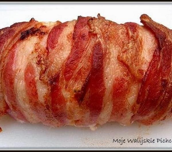 boczku owijamy dokładnie wokół naszej drobiowej roladki. Układamy na blaszce wyłożonej papierem do pieczenia i wkładamy do piekarnika nagrzanego do 220st. Pieczemy ok. 25 minut.