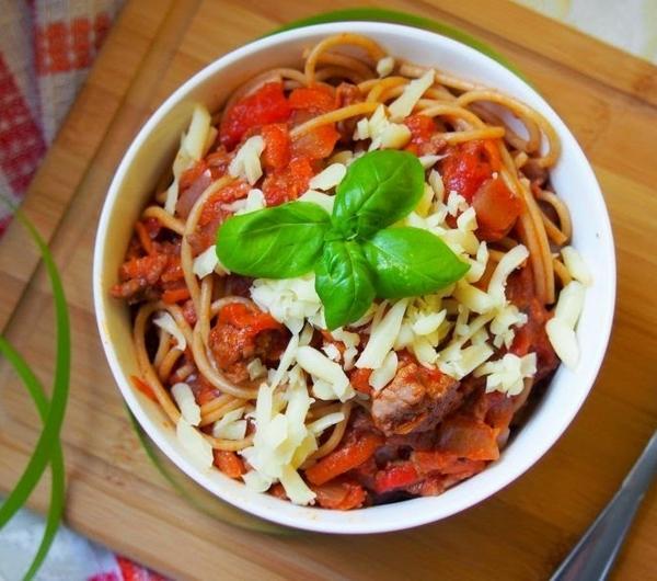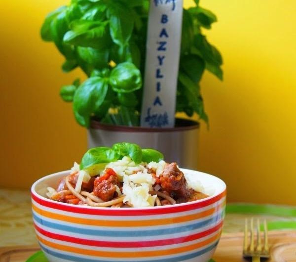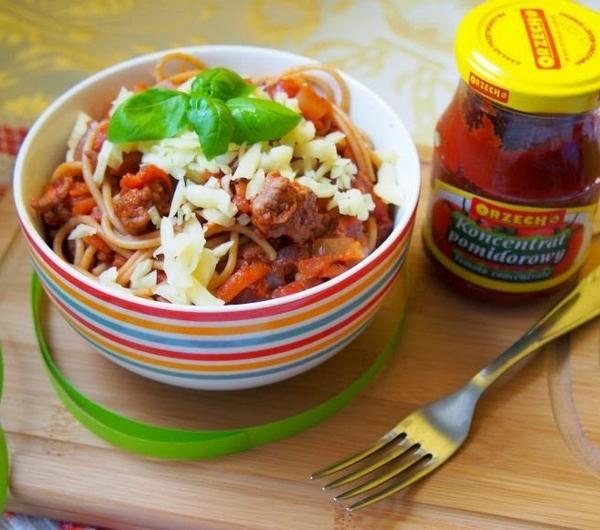 500g mięsa mielonego2 puszki krojonych pomidorów2 duże marchewki2 średnie cebule3 ząbki czosnku3-4 łyżeczki suszonego oregano2 czubate łyżki koncentratu pomidorowego, u mnie Orzech1 szklanka wytrawnego, czerwonego wina8 łyżek mlekakilka łyżek oleju z suszonych pomidorów (można zastąpić zwykłym olejem)sól, pieprzser żółty do posypania (opcjonalnie)liście bazylii do dekoracji (opcjonalnie)1. Marchewkę ścieramy na tarce (małe oczka), cebulę kroimy drobno. Smażymy kilka minut na rozgrzanym oleju.2. Dodajemy przeciśnięty przez praskę czosnek i oregano. Mieszamy.3. Do całości dodajemy mięso mielone, które mieszamy z warzywami i koncentratem pomidorowym. Przyprawiamy solą i pieprzem. Krótko smażymy, po czym wlewamy wino, które odparowujemy.4. Dodajemy pomidory i gotujemy kilka minut.5. Wyłączamy gaz i zostawiamy na około 5 minut. Po tym czasie dolewamy mleko i mieszamy.6. Podajemy z makaronem spaghetti (u mnie z pełnoziarnistym). Posypujemy startym żółtym serem i dekorujemy listkami bazylii.