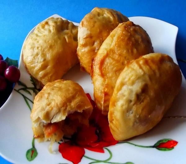 razy swą objętość rozwałkowujemy je na dość cienko i wykrawamy szklanką koła. Na środek nakładamy farsz, zlepiamy pierożki i widelcem doklejamy brzegi. Układamy na blasze wyłożonej papierem do pieczenia , smarujemy rozkłóconym