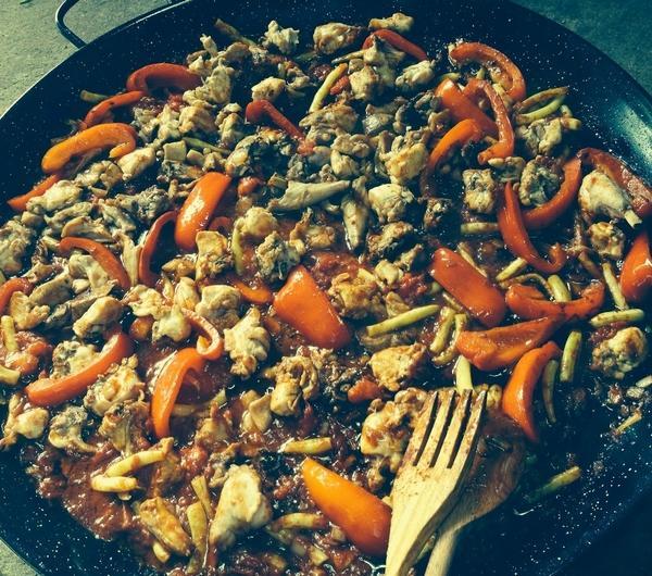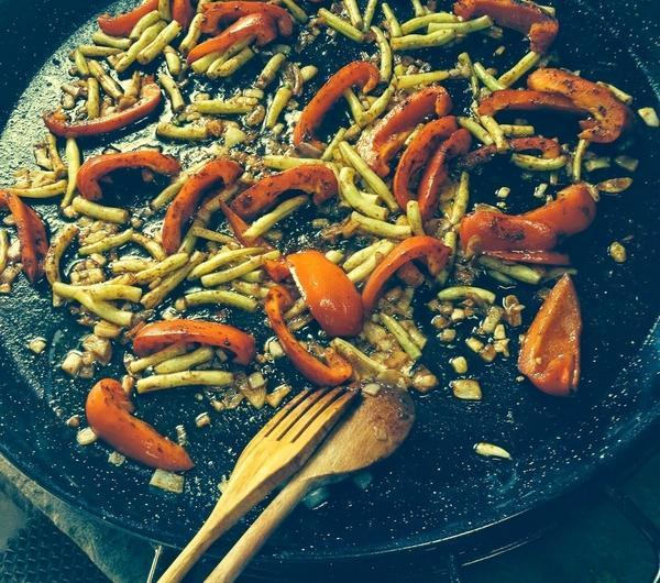 Wtedy na patelnie wrzucamy warzywa. Czosnek, cebulę, paprykę, fasolkę szparagowa oraz na koniec pomidory.