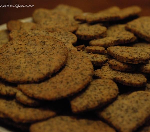 mak. Wszystko szybko zagnieść na gładkie ciasto. Schłodzić je w lodówce przez około 15-30 minut. Po wyjęciu z lodówki ciasto rozwałkować na grubość około 3mm i wykrawać foremką