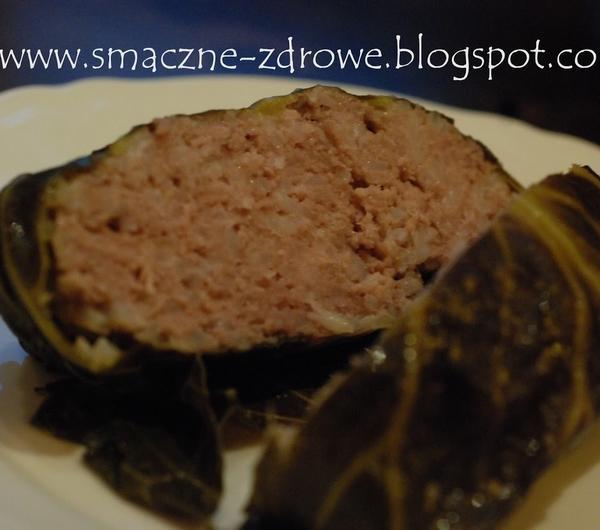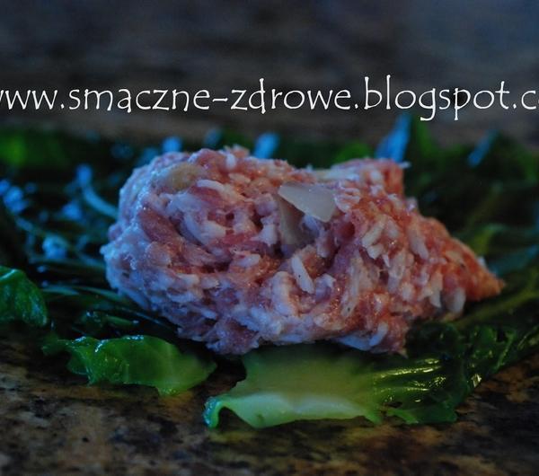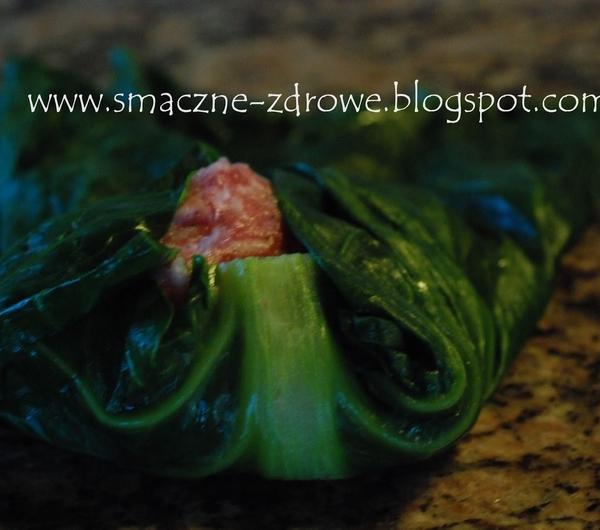 pieprz do smaku. Wyrobić do połączenia składników. Na przygotowane wcześniej liście wyłożyć łyżką farsz