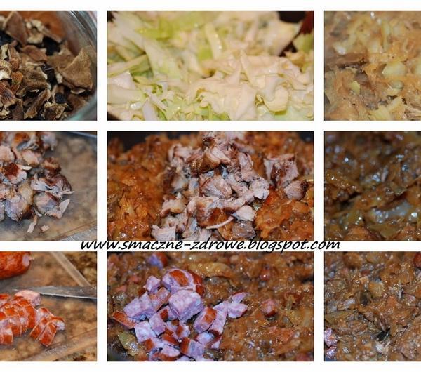 W jednym dużym garnku gotujemy pokrojoną grubo białą kapustę ( solimy ją), można do niej dodać grzyby. W drugim mniejszym gotujemy pokrojoną trochę kapustę kiszoną ( ja miałam resztę od wigilii, z dużą ilością borowików), do gotującej się białej kapusty dorzuciłam jeszcze 2 garście suszonych podgrzybków, tego nigdy za wiele. Kapusty gotujemy ok.1/2h.