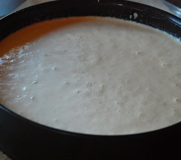 serową przelać do tortownicy (uwaga: jest bardzo płynna) i wstawić do piekarnika nagrzanego do 160*C. Pieczemy ok.1h i 20-25 minut (80-85 minut) bez termoobiegu, tylko program góra-dół. Po tym czasie piekarnik wyłączamy, uchylamy drzwiczki i zostawiamy nasz serniczek jeszcze na godzinkę.