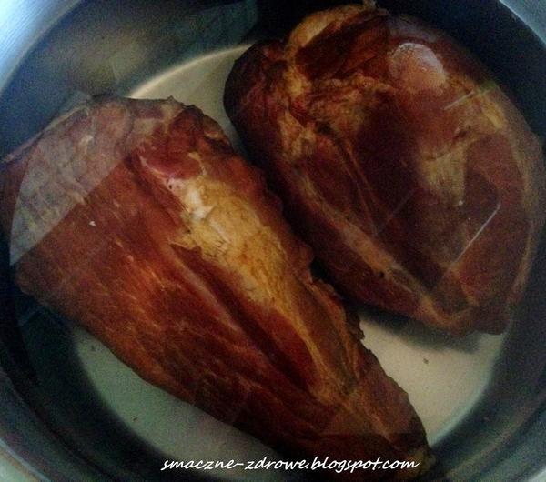 Choć w moim rodzinnym domu jest zwyczaj pieczenia na Wielkanoc szynki w chlebie, to bywa również parzona domowa szynka. Zawsze przygotowywałam ją z tego przepisu, ale odkąd Babcia Lala podzieliła się ze mną swoim sposobem, teraz już zawsze przygotowuję ją wg nowej receptury. Jest to łatwiejszy sposób (nie trzeba szynki pilnować by się nie gotowała, czas parzenia jest również niezależny od wagi), a tak przygotowana szynka jest smaczniejsza, bardziej soczysta. Parzenie polega na trzykrotnym doprowadzeniu do wrzenia i odstawieniu szynki do wystudzenia. Można dodać do takiej szynki swoje ulubione przyprawy, ja dotychczas przygotuję ją bez dodatków, tak smakuje nam najbardziej, ale może z czasem to się zmieni. Ważne by zakupić dobrą, wędzoną dymem, tak jak kiedyś (a nie malowaną dymem wędzarniczym) szynkę. Warto się rozejrzeć, popytać, są jeszcze takie miejsca, gdzie można dokonać takiego zakupu, naprawdę warto, to zupełnie inny smak. Taka dobra, wiejska szynka przygotowana tym sposobem, to rozkosz dla podniebienia. Cudownie aromatyczna, bardzo soczysta, przepyszna. Idealna na wielkanocny stół, ale nie tylko, w ciągu roku też coś trzeba jadać...Wodę od parzenia takiej szynki można wykorzystać jako bazę do przygotowania pysznych zup, m.in. żurku, barszczu,itp. Można również taki bulion zamrozić i wyjąć wówczas, gdy zajdzie taka potrzeba.Składniki:- dobra, wędzona szynka (u mnie myszka i płat szynkowy z wiejskiej wędzarni)- ulubione przyprawy (nie trzeba)- woda żródlana lub filtrowanaSzynkę obmyć pod bierzącą wodą, wytrzeć w ręcznik papierowy i włożyć do garnka. Zalać dobrą źródlaną lub filtrowaną wodą, postawić na palniku i doprowadzić do wrzenia.