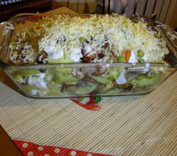 natką. W naczyniu do zapiekania układać warstwami przyprawione warzywa z