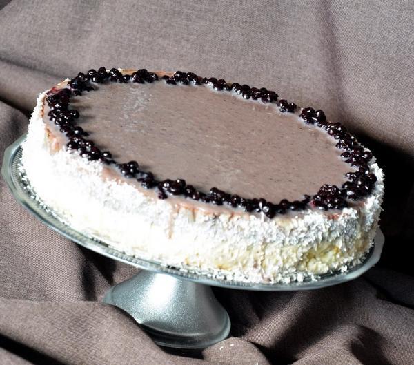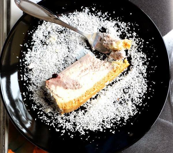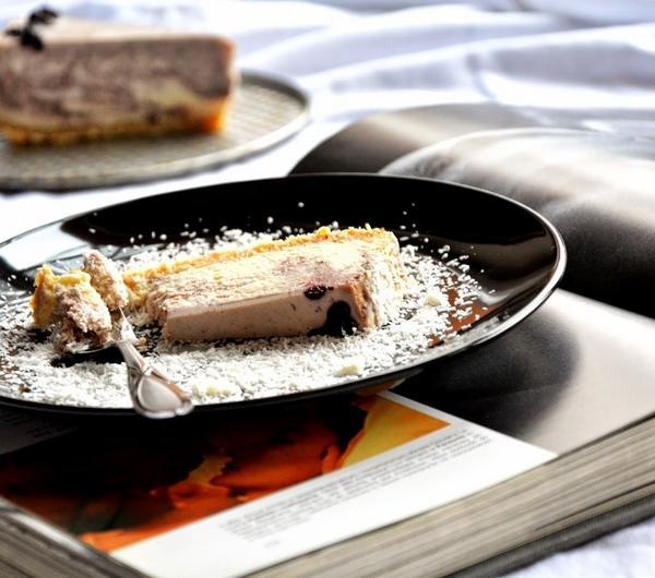 W dzieży robota zmiksować ser twarogowy z mascarpone i cukrem pudrem. Po kolei dodawać jajka, miksując, krótko, pomiędzy. W drugiej misie utrzeć mascarpone z jajkami. Delikatnie połączyć z białą częścią mleczka kokosowego i przetartymi jagodami. Do tortownicy wlewać raz jedną, raz drugą masę. Zrobić esy floresy pałeczką do sushi. Piekarnik rozgrzać do 160 stopni. Piec 50 minut. Zostawić w piekarniku do całkowitego ostudzenia, najlepiej na kilka godzin. Czekoladę rozpuścić w kąpieli wodnej z mleczkiem i sokiem. Polać schłodzony sernik. Boki posmarować lekko schłodzona polewą i posypać wiórkami. Ozdobić jagodami. Pierwszego dnia smakował gościom, drugiego mężowi, Kacprowi codziennie, Wiktor nie zdążył spróbować...