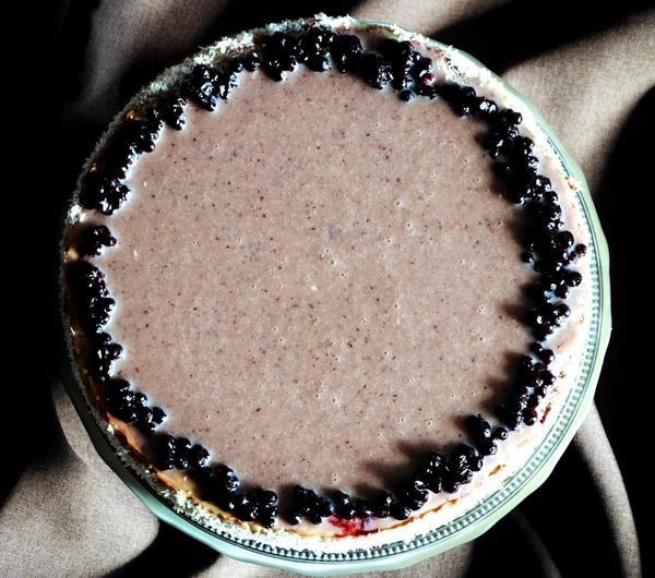 Wszystkie składniki na masy muszą mieć temperaturę pokojową, dlatego najlepiej wyjąć je rano z lodówki i zabrać się do roboty w południe. Zacząć od sera z wiaderka, który należy przełożyć (można zimny) na sitko i poczekać, aż odcieknie cała woda (minimum kilka godzin).Ciastka zmiksować razem z wiórkami i masłem. Spód i boki tortownicy wysmarować masłem. Wyłożyć papierem do pieczenia, przełożyć masę i dokładnie ugnieść metalową łyżką. Zostawić na minimum godzinę, w zimnym miejscu, aż masa porządnie zastygnie. Odlać 4 łyżki soku z jagód i odłożyć 2 łyżki owoców. resztę przetrzeć przez sito. Jeśli używamy dżemu, najpierw podgrzać i ciepły przetrzeć prze sito.