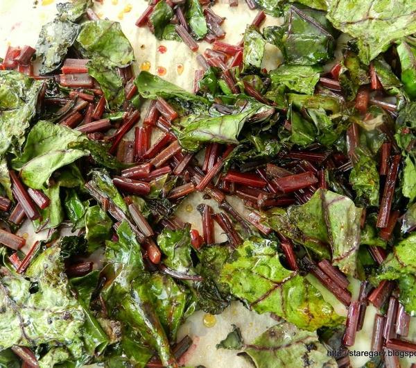 Botwinkę umyć, osuszyć, łodyżki pokroić na drobne kawałki, liście pokroić w spore paski. Położyć na blachę wyłożoną papierem do pieczenia, posypać lekko