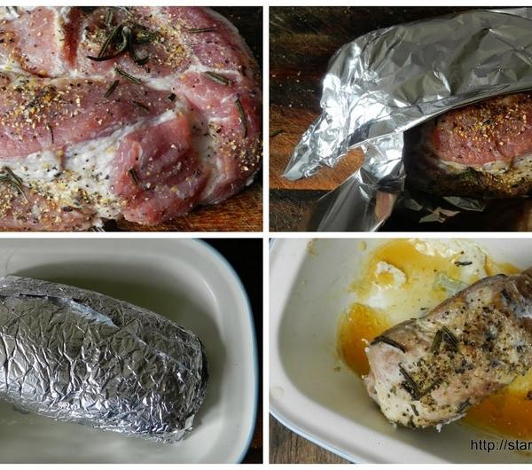 rozmarynem.Zawinąć w folię aluminiową. tak owiniętą obsmażyć z każdej strony na dobrze rozgrzanej patelni, najlepiej takiej którą możemy wstawić do piekarnika. Piekarnik rozgrzać do temperatury 165 st. wstawić patelnię z