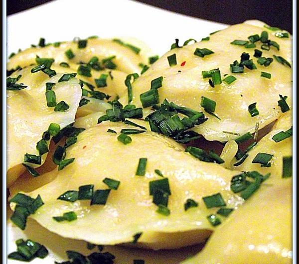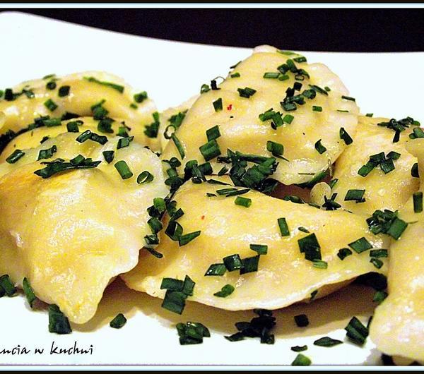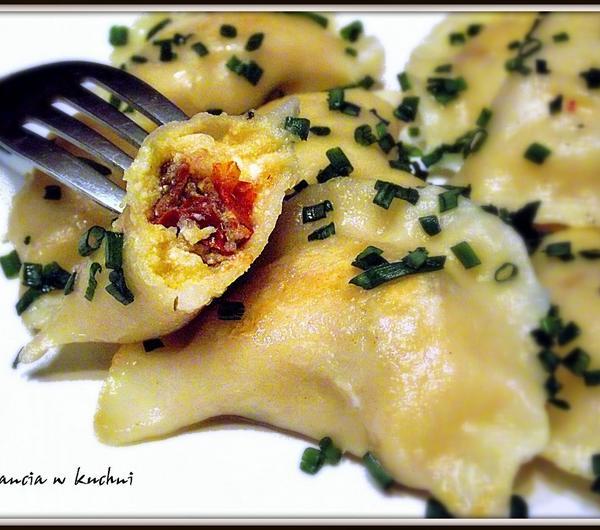 I właśnie za to uwielbiamy pierogi - przyrządzamy je z dodatkami, na które akurat mamy ochotę. Ciasto jak i farsz można dowolnie urozmaicać, dodawać różne przyprawy i ulubione składniki. U mnie dzisiaj zdecydowanie rządzą suszone pomidory. Pierożki są bardzo aromatyczne, posiekany szczypiorek nadaje im delikatną chrupkość i świeżość :)Składniki:ciasto na pierogi:350 g mąkiok. 125 ml gorącej wody1/4 szkl olejusólfarsz:300 g białego sera1 duża cebula500 g ugotowanych ziemniaków8 suszonych pomidorówsól, pieprzomasta:2 łyżki masła2 łyżki posiekanego szczypiorku1. Mąkę przesypujemy na stolnicę i stopniowo dodajemy wrzącą (!) wodę wymieszaną z olejem. Ciasto dokładnie wyrabiamy.Ilość wody zależna jest od stopnia chłonności mąki. Ciasto musi być elastyczne i miękkie, a po rozciągnięciu nie może od razu wysychać.2. Cebulę obieramy, kroimy w piórka i podsmażamy na oleju na złoty kolor. Doprawiamy solą i pieprzem. Ziemniaki, biały ser i cebulę przepuszczamy przez maszynkę do mielenia mięsa. Suszone pomidorki kroimy w drobną kostkę i dodajemy do masy. Całość dokładnie mieszamy i doprawiamy do smaku solą, pieprzem i ziołami prowansalskimi.3. Część ciasta odkrawamy i chowamy do woreczka jednorazowego, a resztę wałkujemy na cienki placek. Szklanką lub foremką wykrawamy kółka, nakładamy po łyżce farszu i zlepiamy w pierożki. Tak samo postępujemy z pozostałą częścią ciasta.4. Do dużego garnka wlewamy wodę i trochę oleju. Gdy zawrze, wrzucamy do niej pierogi i od momentu zagotowania trzymamy na ogniu jeszcze ok 1 minuty. Ciepłe pierogi przekładamy na rozgrzaną patelnię z roztopionym masłem, chwilę podsmażamy, a przed podaniem posypujemy posiekanym szczypiorkiem.SMACZNEGO :)