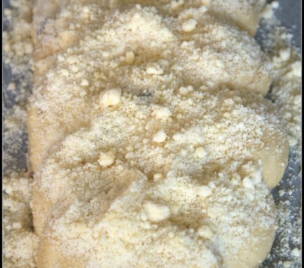 4. Chałkę przekładamy na blachę do pieczenia, przykrywamy ścierką i pozostawiamy do wyrośnięcia na ok 30 minut. W tym czasie robimy kruszonkę - wszystkie składniki potrzebne do jej przygotowania mieszamy w misce (palcami lekko rozcieramy grudki).5. Wyrośniętą chałkę smarujemy rozmąconym jajkiem i posypujemy kruszonką. Pieczemy w 175*C przez ok 35 minut.